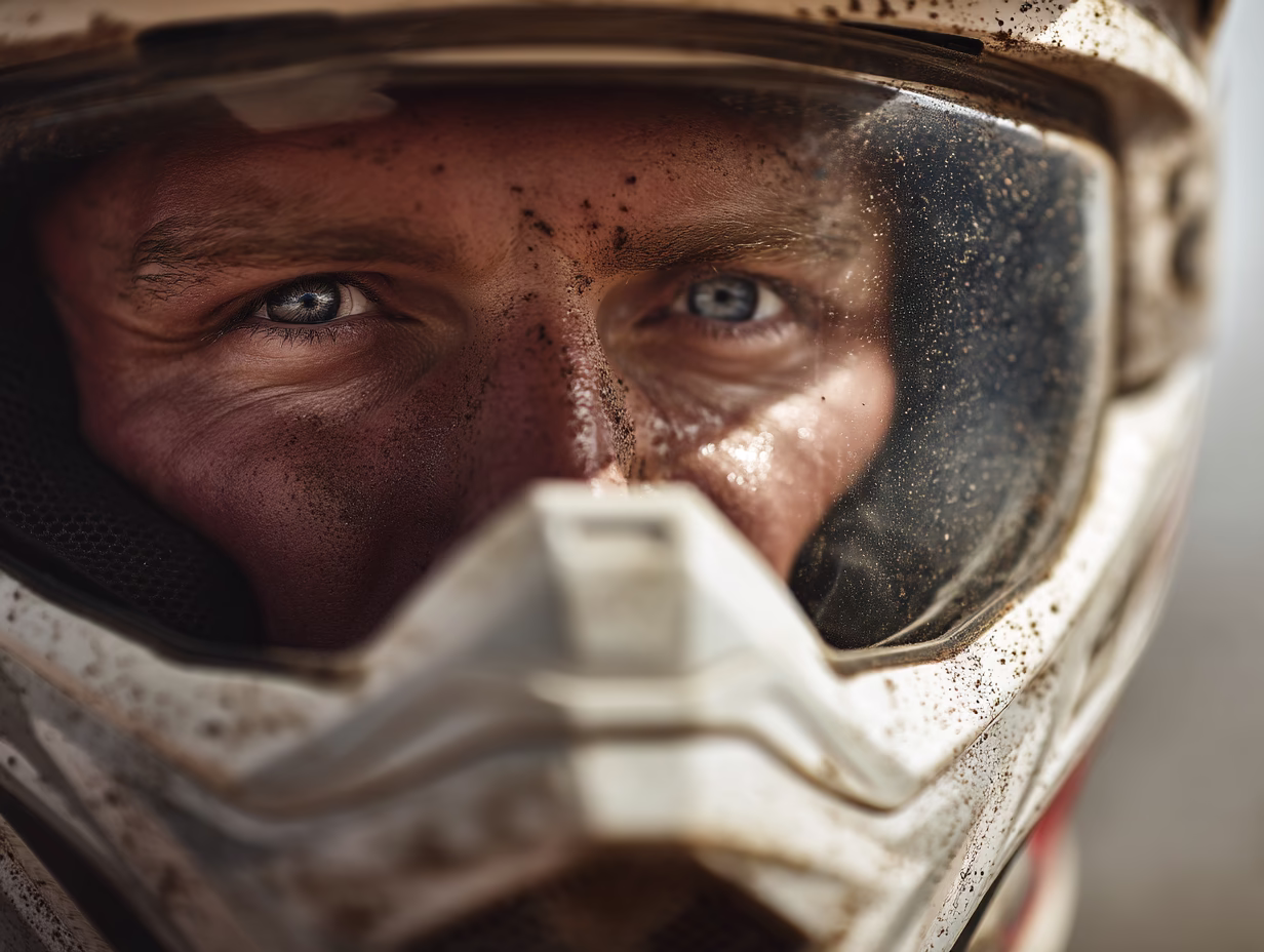 This image features an intense close-up of a face covered in dirt, wearing a protective helmet. The deep blue eyes contrast with the reddened skin and the residues of earth and dust. The helmet's visor is dirty, reflecting an arid environment. The lighting highlights the textures of the dirt and the