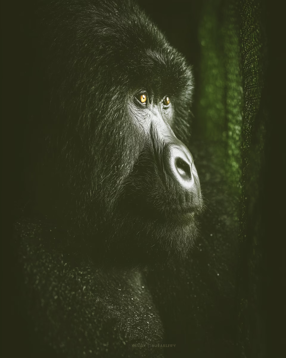 This close-up portrait of a gorilla showcases its dark fur and intense gaze. Soft lighting highlights facial details and texture, creating a contemplative and natural atmosphere. The focused composition enhances the contrast between the gorilla and the dark green background, with shallow depth of a