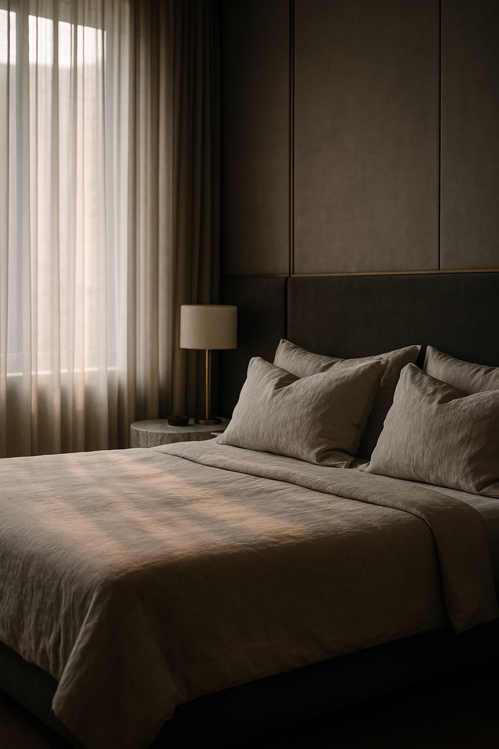 Discover this elegant bedroom featuring a neutral-toned bed, sheer curtains filtering soft light, and a modern lamp beside it. The warm lighting creates a cozy atmosphere, emphasizing a minimalist and sophisticated design. The neutral color palette is complemented by a dark wall panel, providing a a