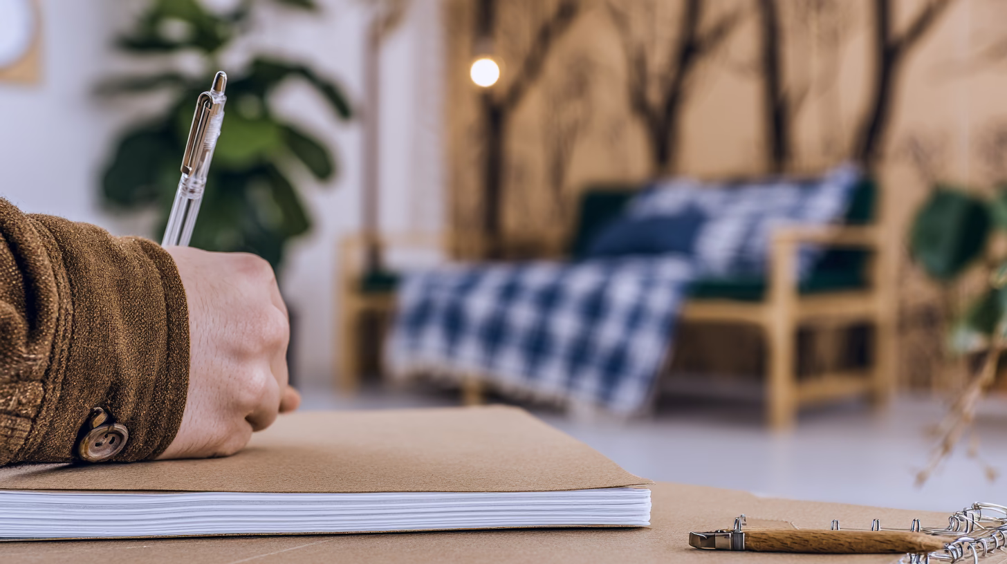 A hand holding a pen over a notebook in a cozy room with soft lighting. The blurred background reveals wooden furniture and a plant, creating a calm and inviting atmosphere. The focus is on the act of...