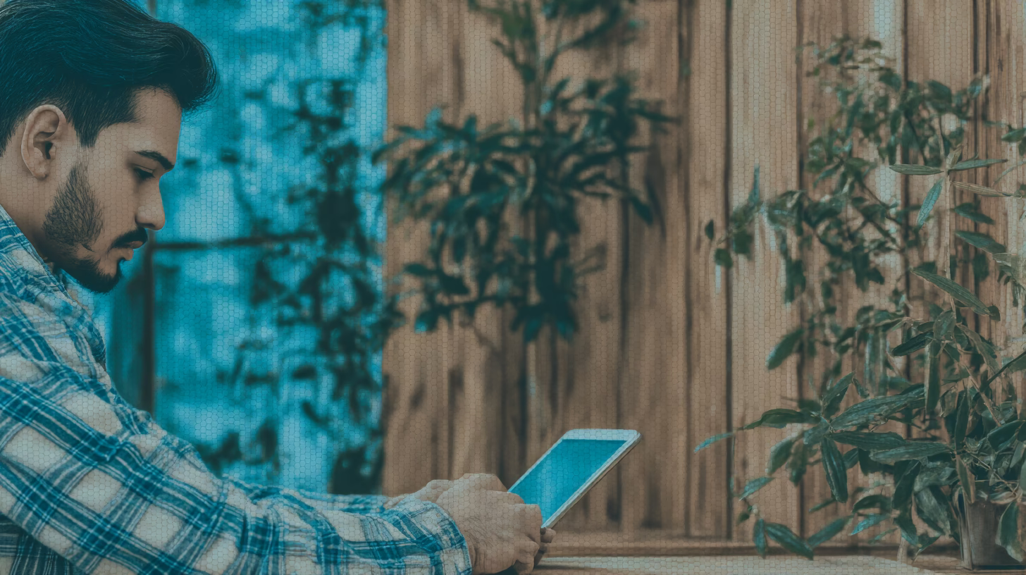 A man in a blue checkered shirt is using a tablet in an outdoor setting surrounded by plants. The soft lighting and balanced composition create a calm and focused atmosphere, perfect for productivity.