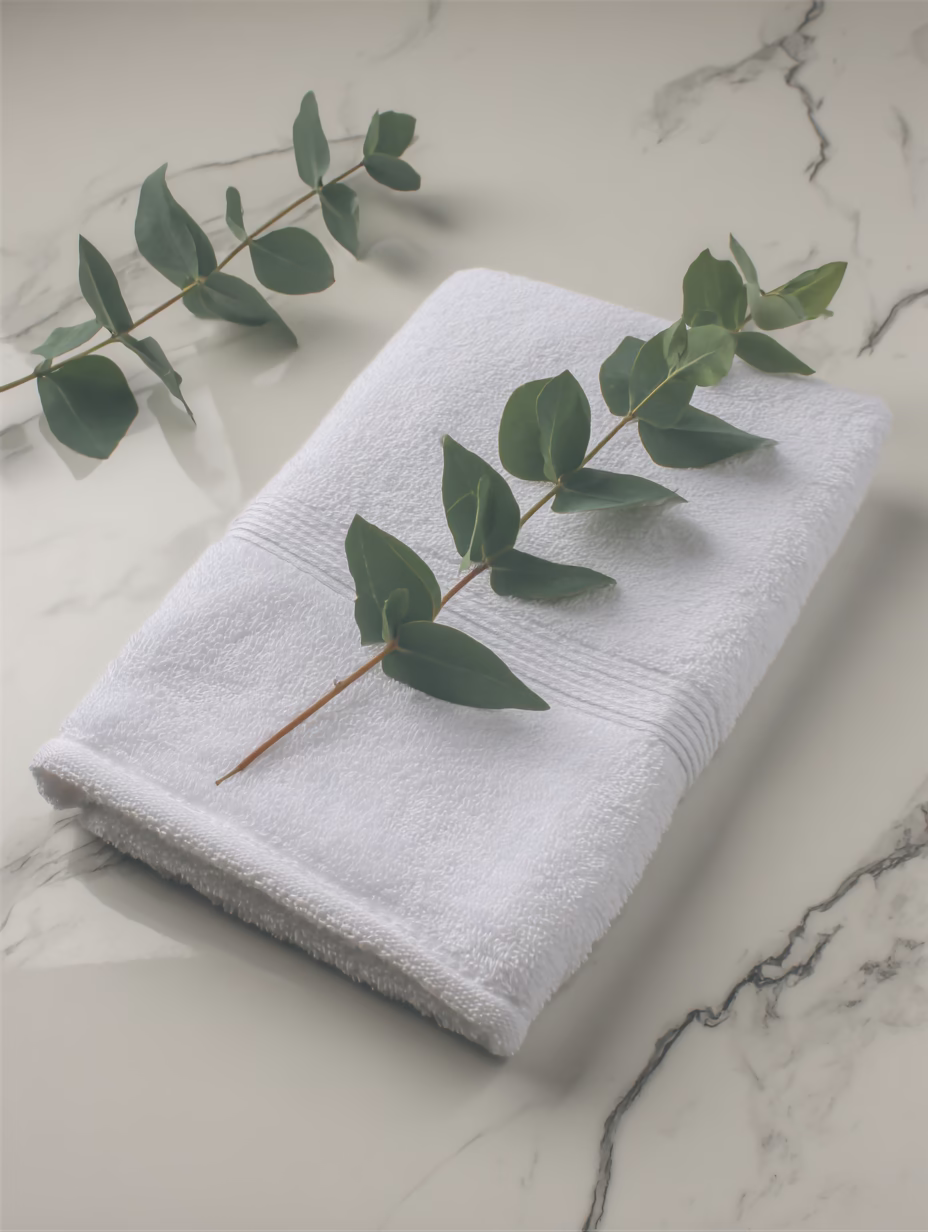 Discover the elegance of a white cotton towel placed on a marble surface, accompanied by a eucalyptus branch. This serene and minimalist setup is perfect for spa environments or interior decoration, adding a touch of luxury and well-being to your space.