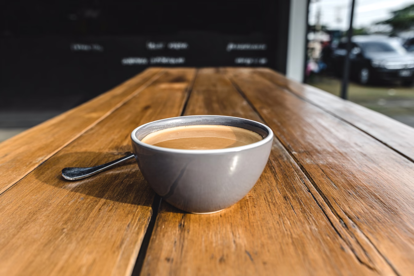 A gray ceramic coffee cup rests on a rustic wooden table, illuminated by natural light, creating a cozy and serene atmosphere in an outdoor café. Perfect for those seeking a peaceful moment with their favorite brew.