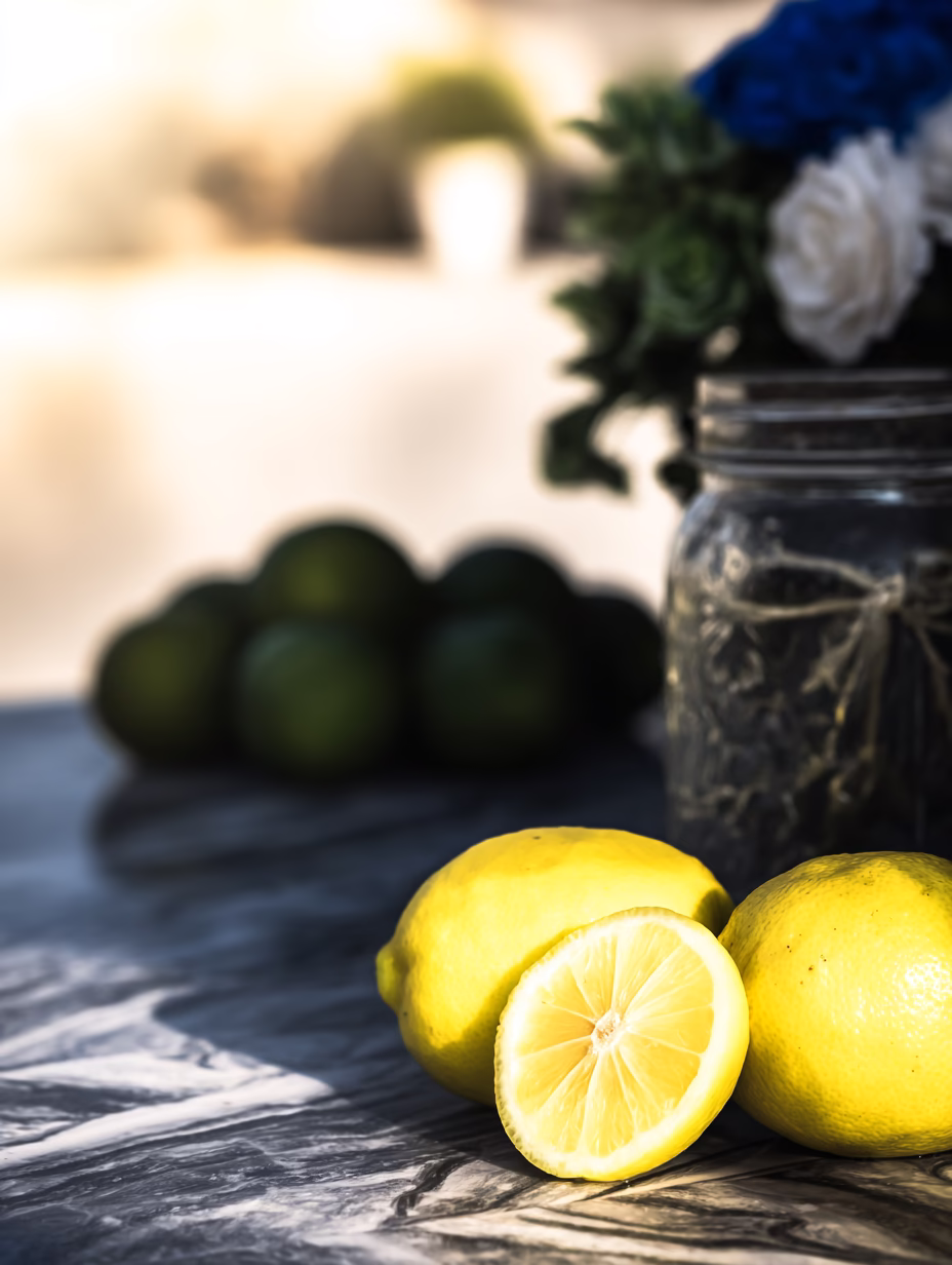 Fresh lemons beautifully arranged on a marble table, illuminated by soft light. A glass jar and blurred flowers in the background create a vibrant and sophisticated contrast, perfect for enhancing your decor or culinary projects.