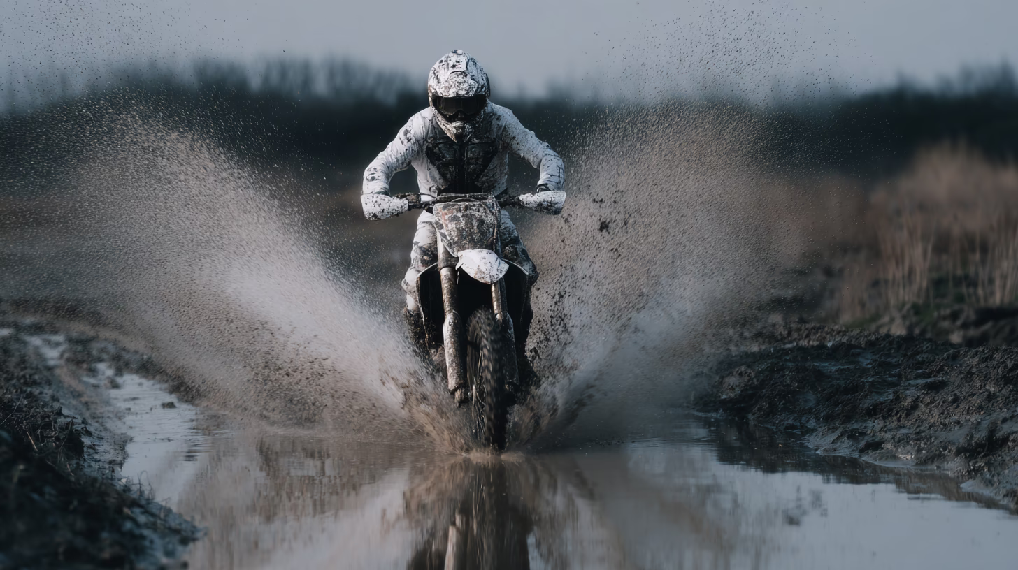 This dynamic image showcases a motorcyclist in action, skillfully navigating through a puddle of muddy water. Dressed predominantly in white and splattered with mud, the rider leans into the turn, conveying a sense of speed and movement. Water sprays around the motorcycle, creating a visually arrest