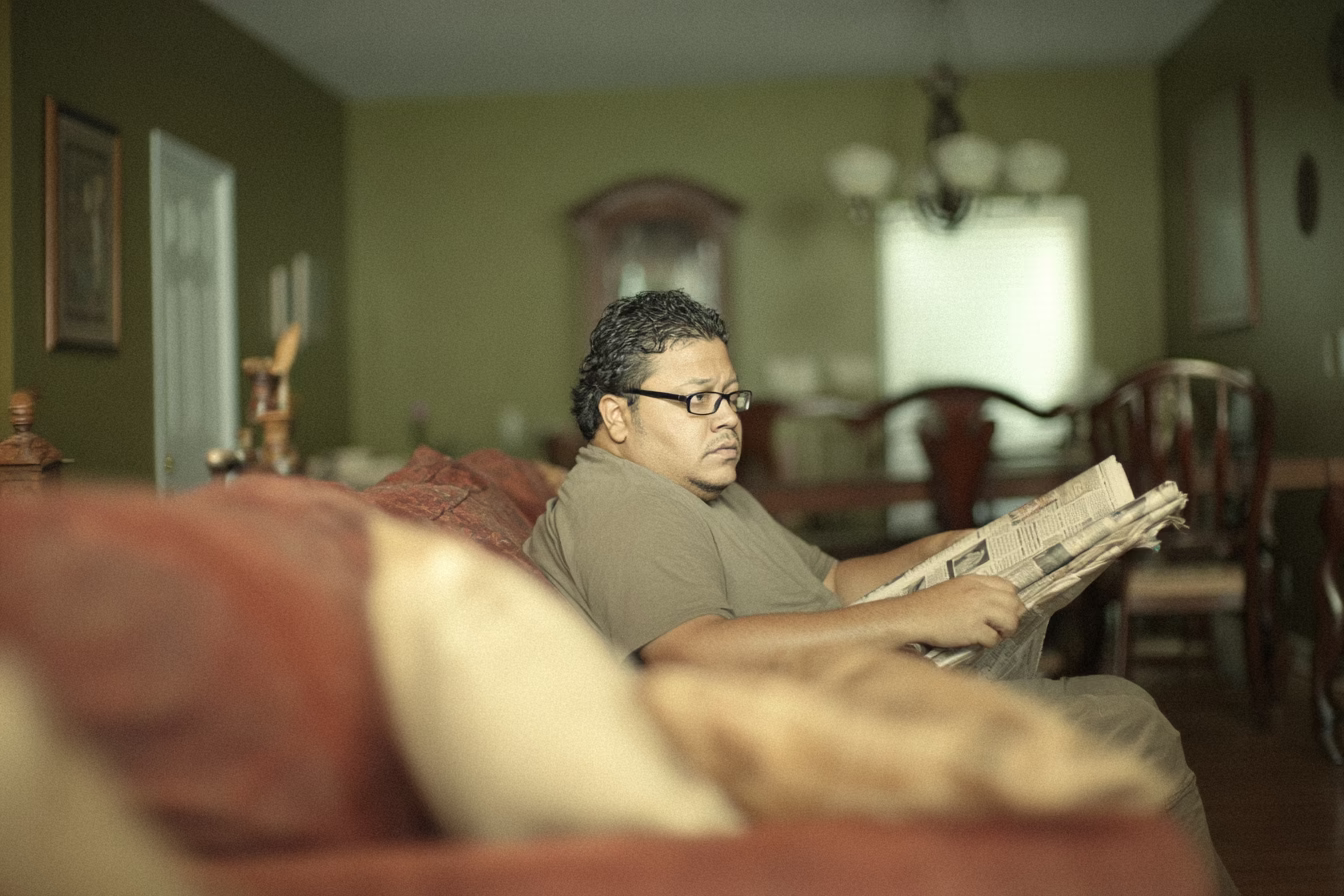 A man is sitting on a sofa, reading a newspaper in a cozy living room with soft lighting and earthy tones. The blurred background reveals a dining area with subtle decor. The composition uses depth of field to highlight the subject while maintaining a serene and introspective atmosphere.