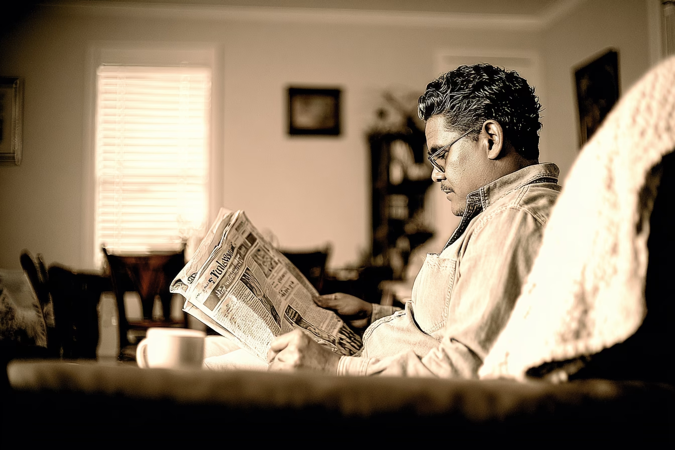 A man sits in a cozy room, reading a newspaper as soft light filters through the window, evoking tranquility and introspection. The sepia tone adds a vintage and nostalgic feel, making it perfect for themes of reflection and relaxation.