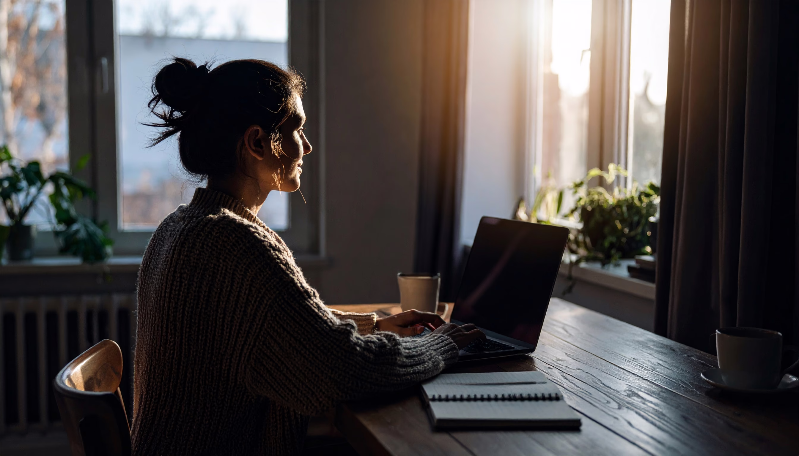 Cozy Scene with Soft Sunset Light on a Woman Working on Laptop