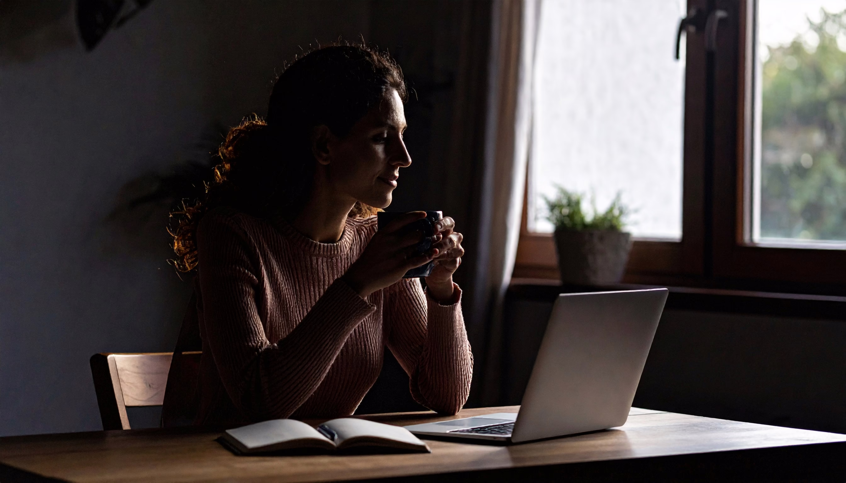 A woman in a dark room illuminated by natural light, holding a mug, with a laptop and a book on the table near a window. Perfect for showcasing cozy workspaces or moments of relaxation.