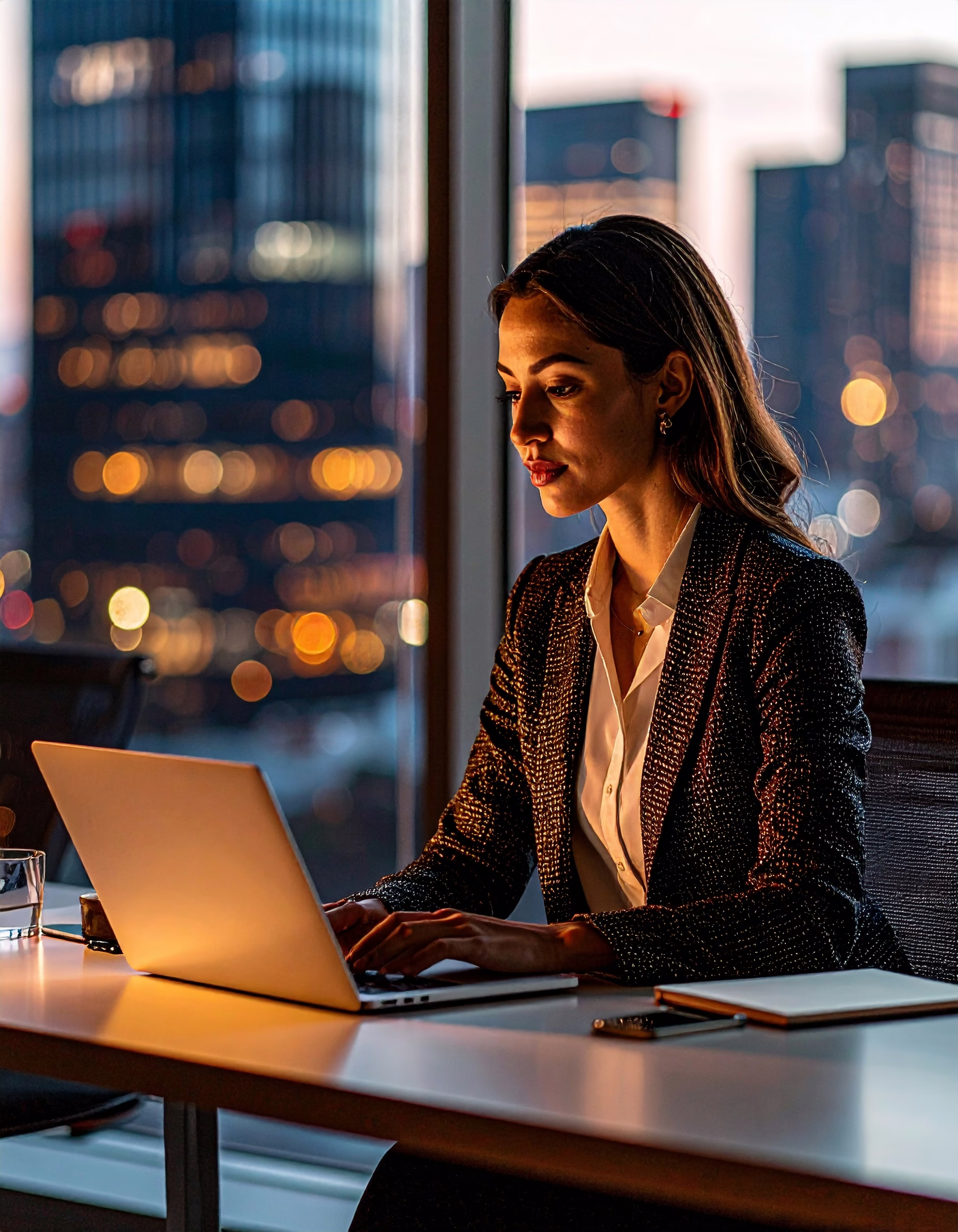 A focused executive works on her laptop in a modern office, featuring a stunning night view of the illuminated city. This image captures an ambiance of concentration and professionalism in a sophistic...