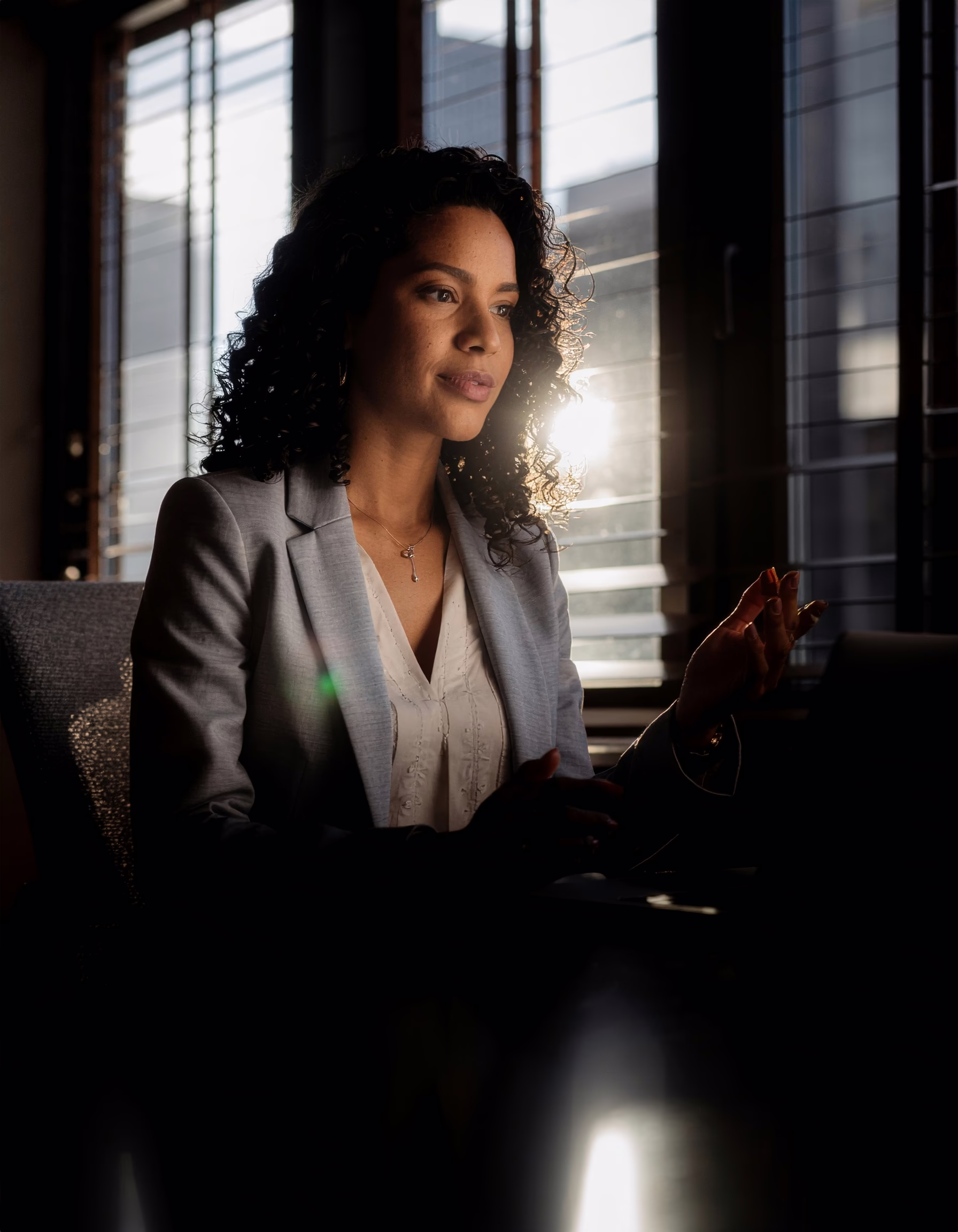A woman in a bright office space illuminated by intense natural light streaming through windows, creating a dramatic contrast. She wears a gray blazer and has a contemplative expression, captured in profile. The scene conveys professionalism and serenity, with a soft focus on her, highlighting the e