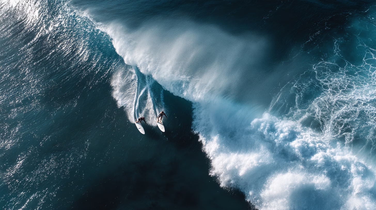 Experience the thrill of surfing with this stunning aerial view of two surfers riding high waves in a deep blue ocean. The vibrant sea foam contrasts beautifully against the calm waters, making it a perfect image for water sports enthusiasts and adventure seekers.